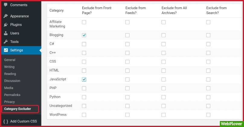 After download, install & activate the plugin. Then go to Settings → Category Excluder